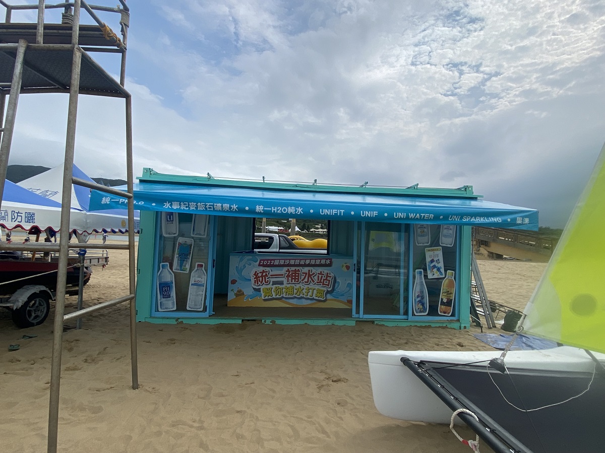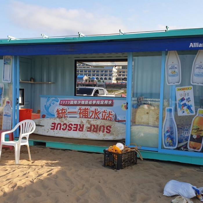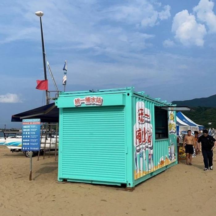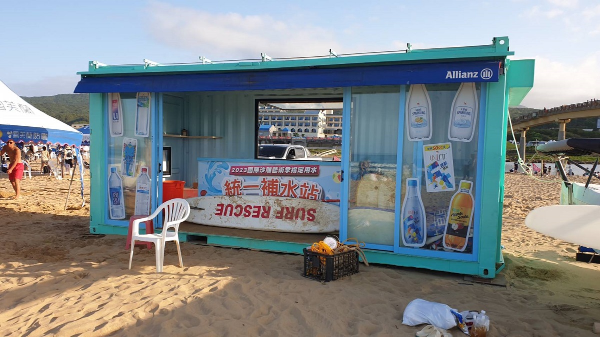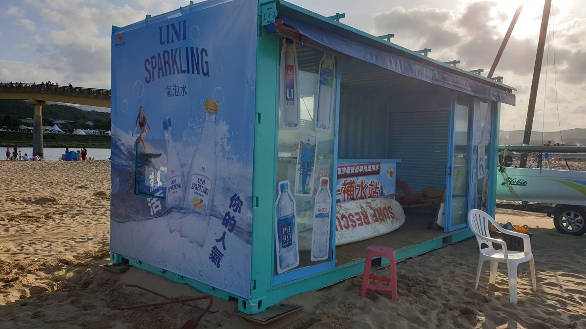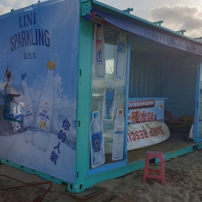 ❷ 活動內容概述:20呎貨櫃屋改裝後,不僅做為急救服務站,貨櫃屋設計上廣告圖案,還能讓廠商加強形象行銷。放在沙灘上,顯眼且有著異國風情的貨櫃屋,除了可以販賣商品飲料又能讓救生員遮蔭,一個貨櫃數個用途,好方便