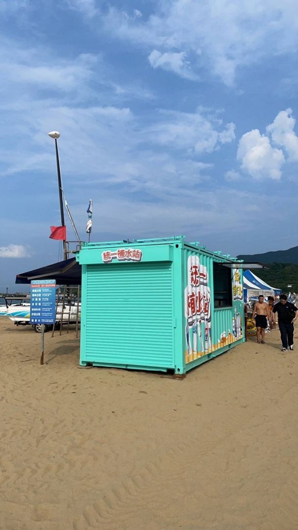 ❹ 運用的貨櫃屋設計:20呎貨櫃正面做滑門,側面做鐵捲門,颱風來時關起來不怕颱風吹,外部噴塗廠商指定的亮眼藍綠色,以及加裝伸縮帆布,再搭配大圖輸出精緻圖案,整體搶眼吸睛,是沙灘上的另一道風景