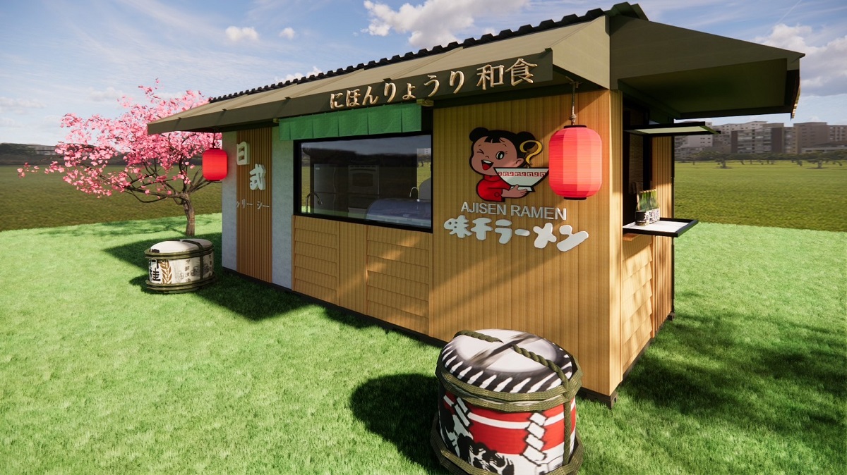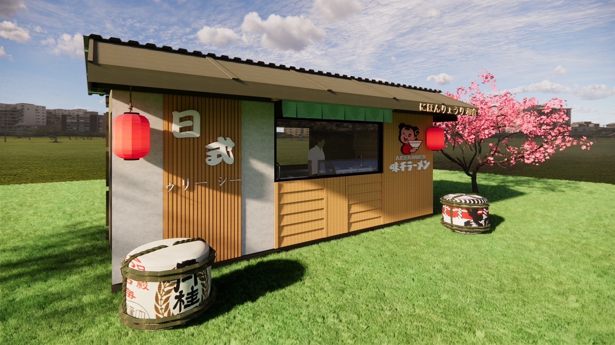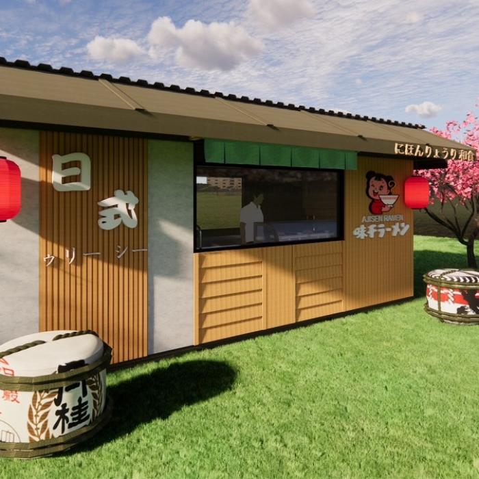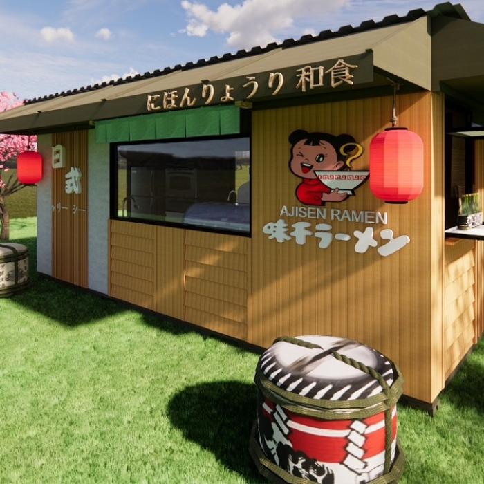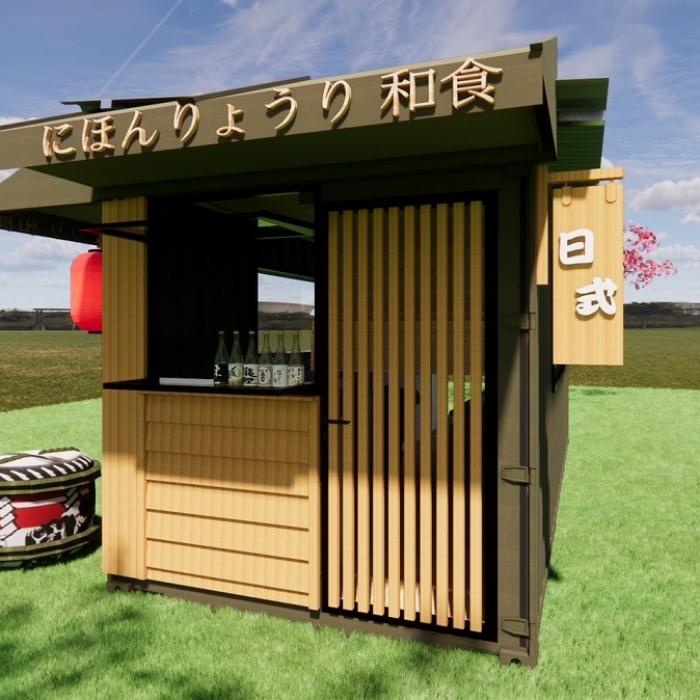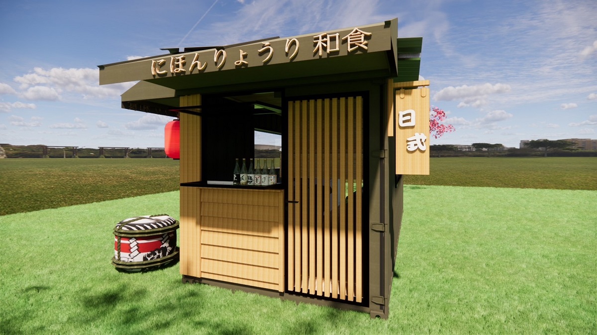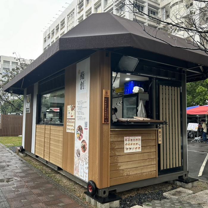 ❹運用的貨櫃屋設計:貨櫃的外部使用了塑木及南方松、水泥板做造型牆面,打造日式氛圍感,並在貨櫃的內外做了隔熱棉及隔熱屋頂,畢竟是廚房販賣商品,隔熱工程要做好!!